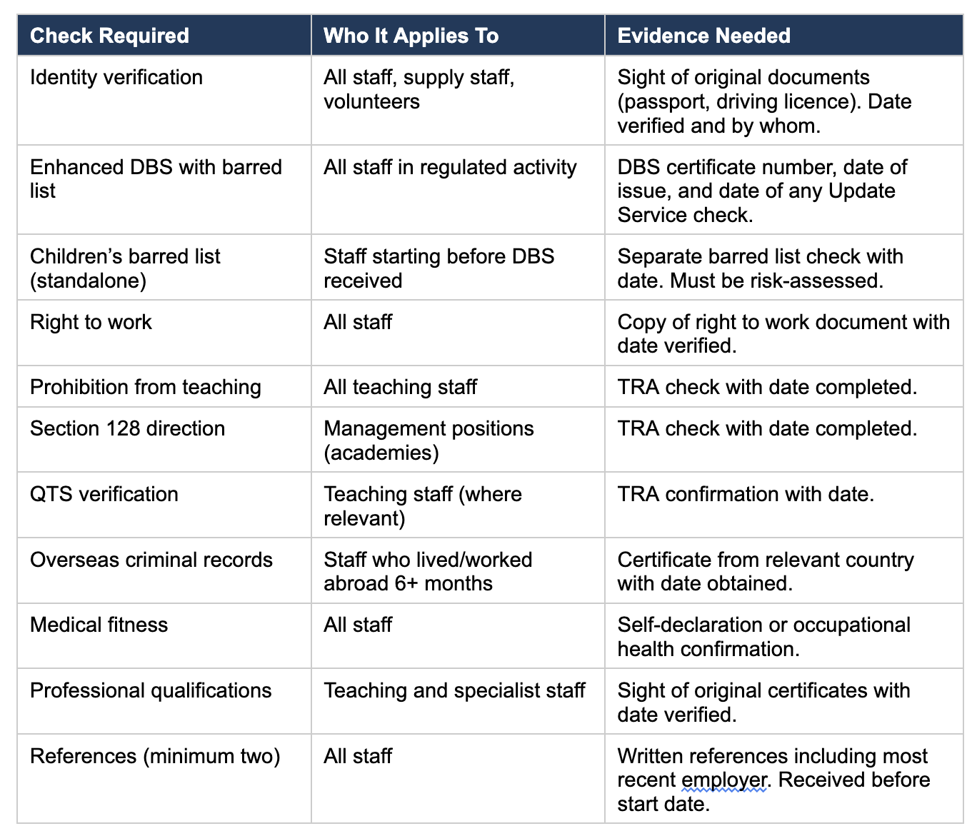 Your Single Central Record must demonstrate that every required pre-employment check has been completed, dated, and evidenced for every individual who works at your school. Use the table below as a working checklist: